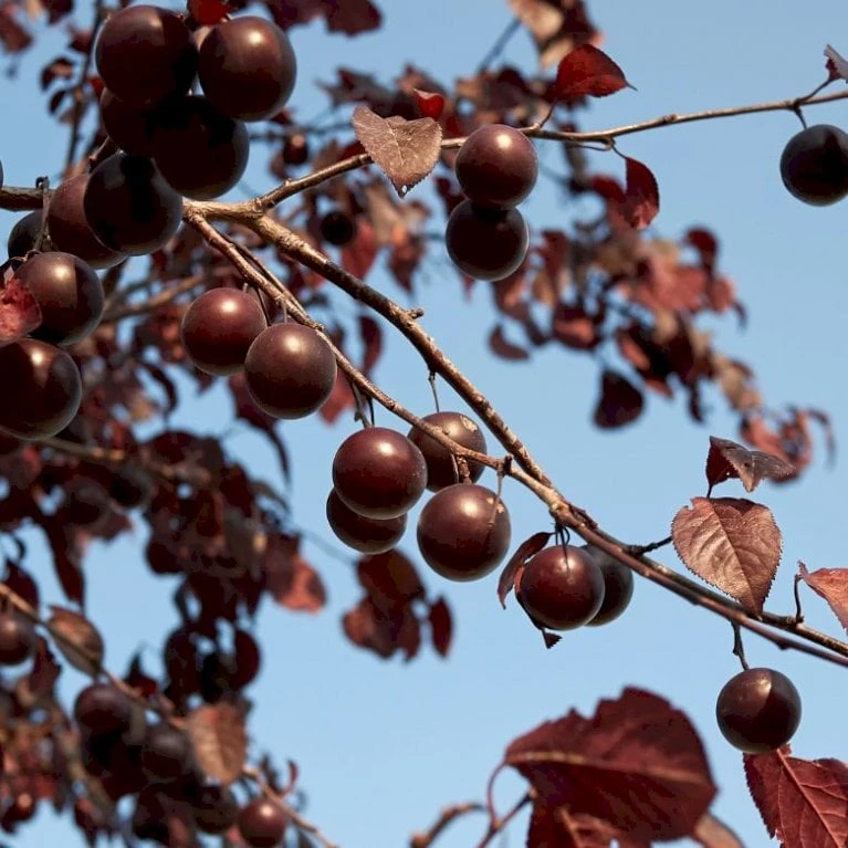 Sætter røde spiselige frugter (mirabeller) der modner i juli/august.