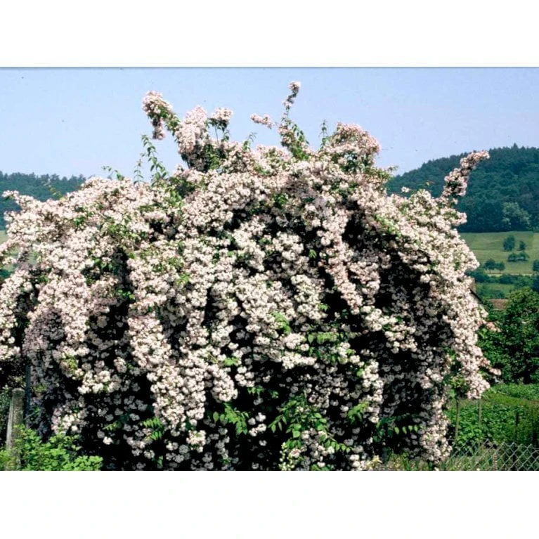 Rig blomstring i juni måned. Ældre buske kan stå ganske dækket af dunede rosa, klokkeformede blomster. Vægten af blomsterne tynger de unge grene ned i yndefulde buer.