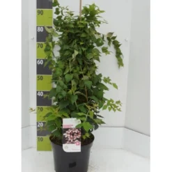 Middelstor busk, lidt mere kompakt end den rene art, med overhængende vækstform og små, dunede friskgrønne blade i vækstsæsonen, senere fine høstfarver. Løvfældende.