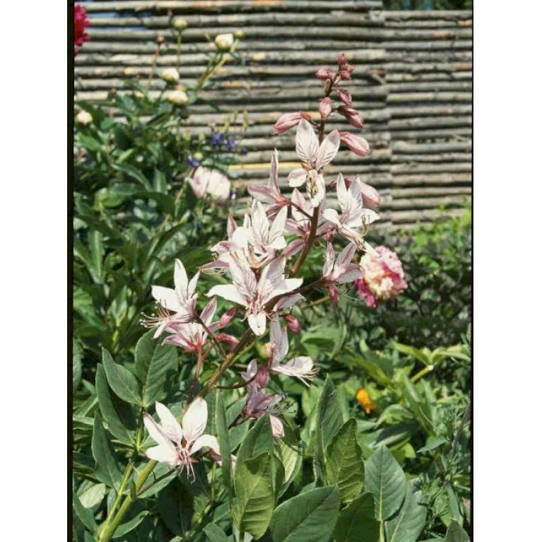 maj-juni. Særprægede lysrosa blomster med mørkere tegninger og lange, buede støvdragere. Senere ses dekorative frøstande.