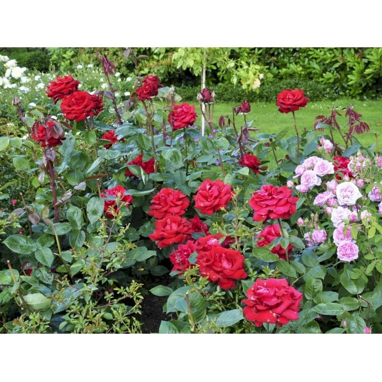 Storblomstrende rose. Plantes gruppevis i rosenbede med en planteafstand af 40 cm.