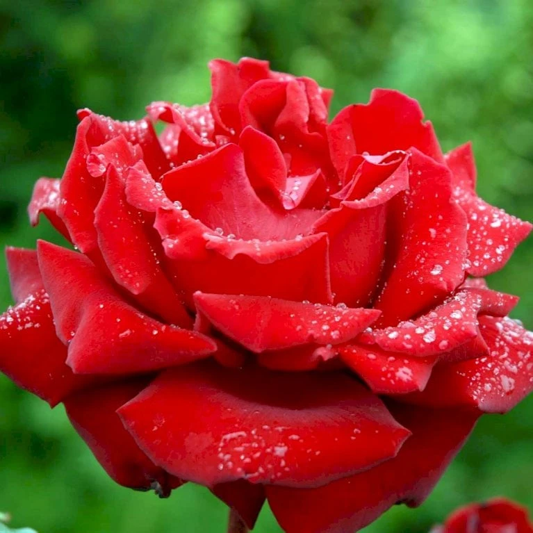 Blodrød med fløjlsagtigt skær. Stor, velformet fyldt blomst med let duft. 25-40 kronblade. Op til 15 cm i diameter.