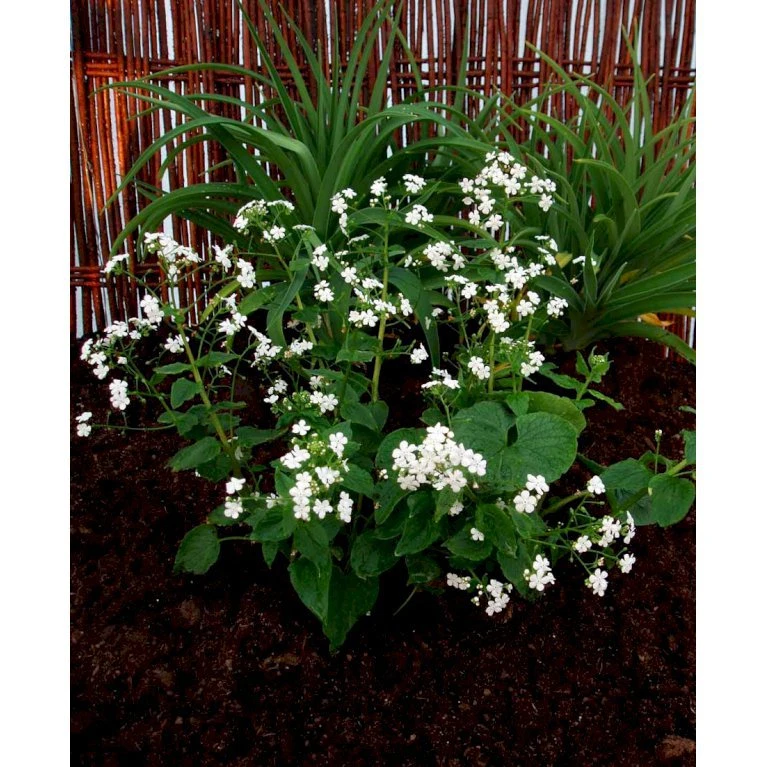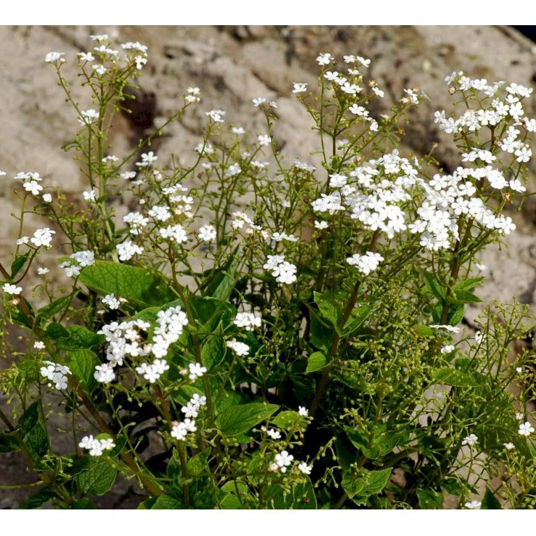 Maj – juni. Små lette, blomster, som minder om hvide forglemmigej. Senere håndstore, friskgrønne blade.