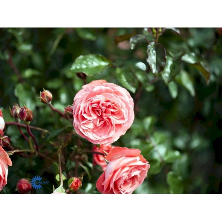 Meget smuk nuance af koralrosa. Middelstor og velfyldt blomst med let duft. 20-40 kronblade. 7-9 cm i diameter.