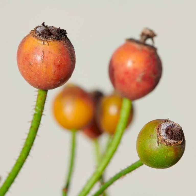 Årets sidste blomster er efterfuldt af orangerøde hyben, som nydes af havens fugle igennem vinterperioden.